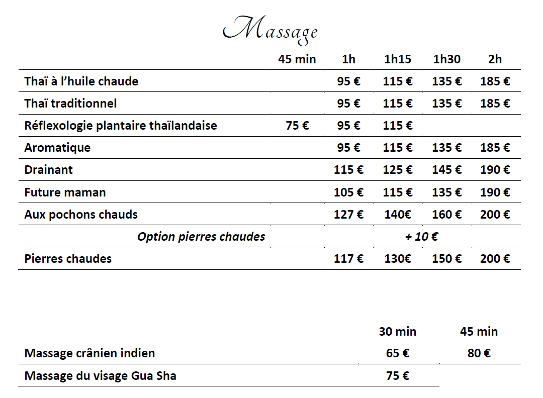 Il existe différents types de massages, chacun ayant ses propres techniques et objectifs spécifiques. Parmi les types courants de massages, on trouve le massage suédois, qui utilise des mouvements fluides et des pressions modérées pour détendre les muscles ; le massage des tissus profonds, qui vise à soulager les douleurs chroniques en ciblant les couches profondes des muscles ; le massage sportif, qui est destiné aux athlètes pour améliorer les performances et récupérer après l'effort ; et le massage thaï, qui intègre des étirements et des pressions pour stimuler l'énergie du corps.