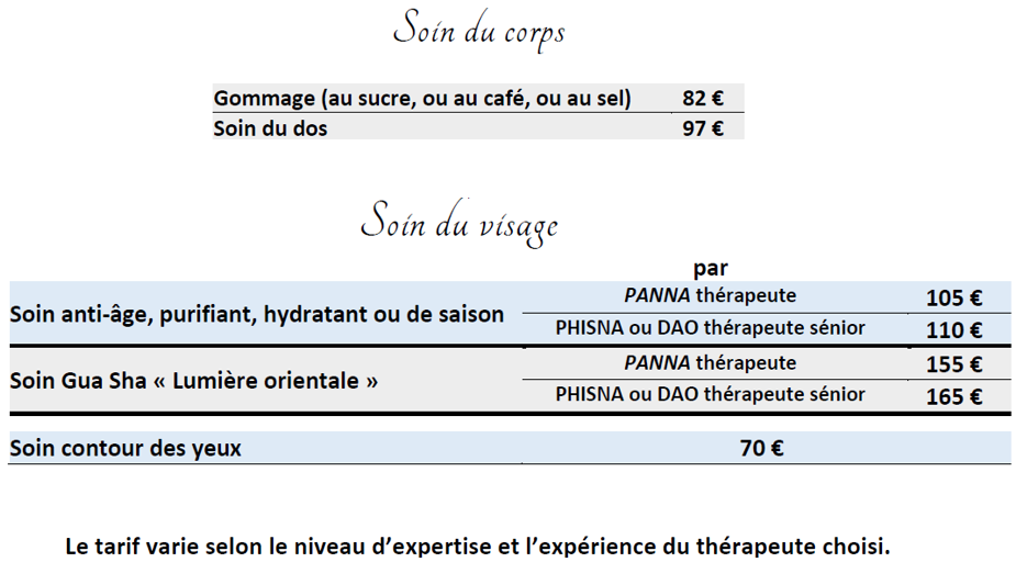 Les soins du corps englobent une gamme de traitements qui visent à nourrir, hydrater et revitaliser la peau. Ils peuvent inclure des massages relaxants, des gommages pour éliminer les cellules mortes, des enveloppements corporels pour hydrater en profondeur, des soins de la peau pour réduire l'aspect de la cellulite et des soins spécifiques pour les mains, les pieds et d'autres parties du corps.